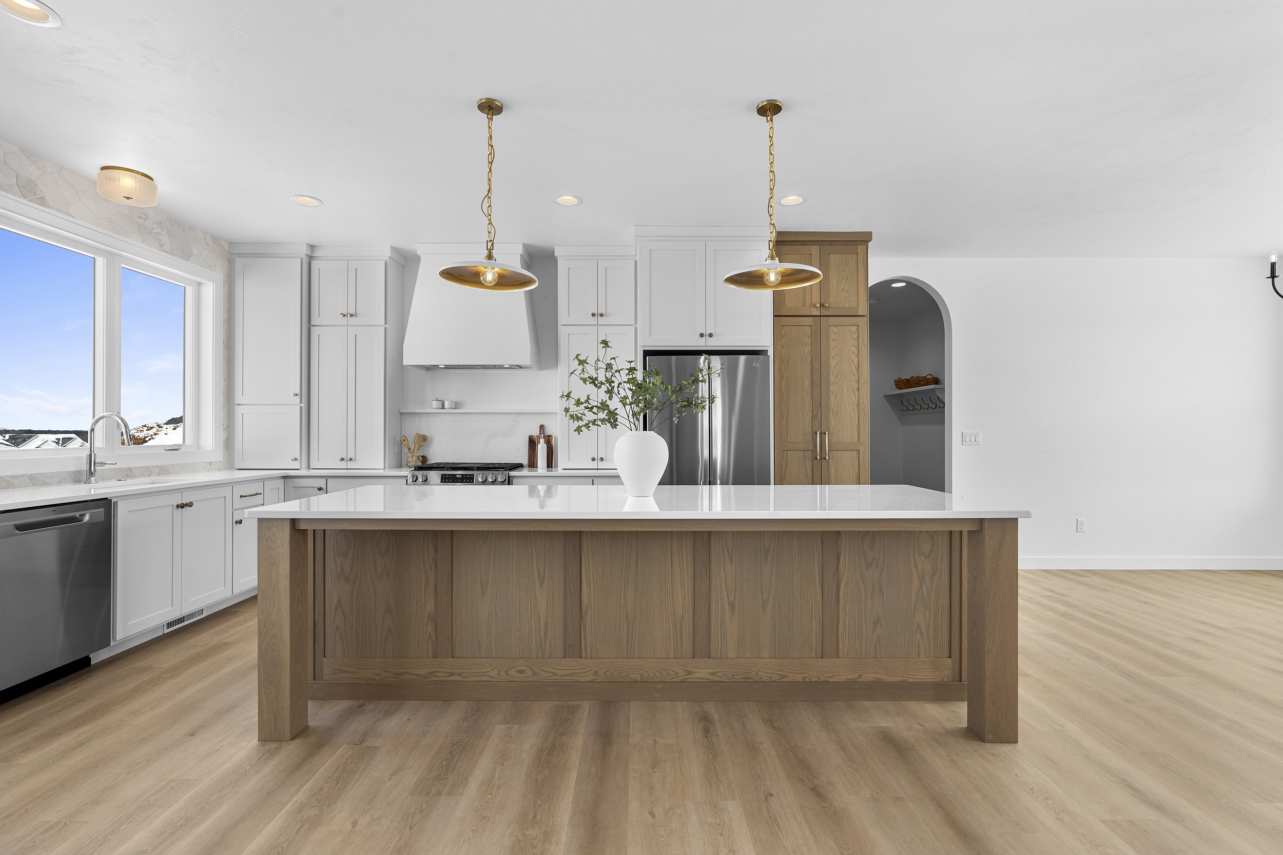 Inside, the open-concept floor plan centers around a soaring great room anchored by a cozy gas fireplace, seamlessly flowing into the dining area and gourmet kitchen. The kitchen features a large island, and custom-built cabinetry designed to impress, while the flooring throughout includes a high-end mix of luxury vinyl planking, luxury vinyl tile, and plush carpet for style and durability. The master suite is a true retreat with a spa-inspired bath—complete with dual vanities, soaking tub, walk-in shower—and a spacious walk-in closet.
