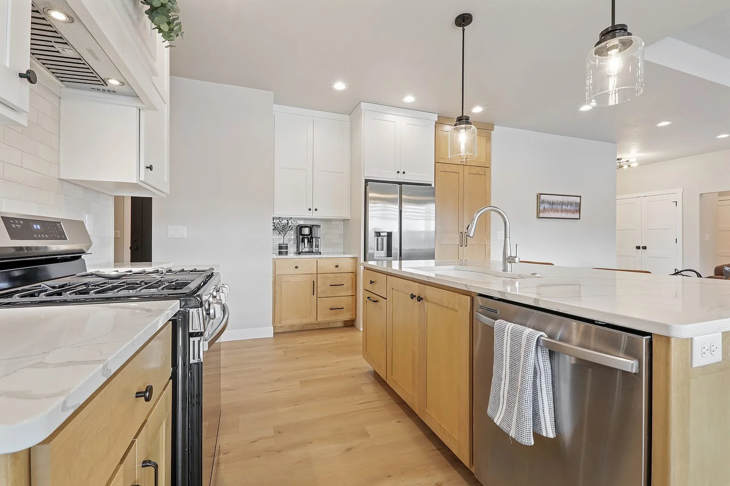 The primary suite is privately positioned on one side of the home, offering a spacious bedroom, dual-vanity bath, separate shower, and walk-in closet. This thoughtful separation from the secondary bedrooms enhances privacy and comfort. Convenient access to the laundry and garage entry supports smooth daily routines.