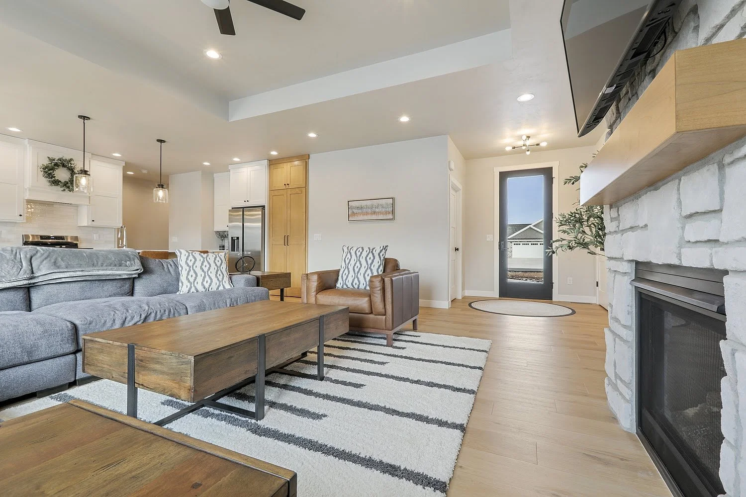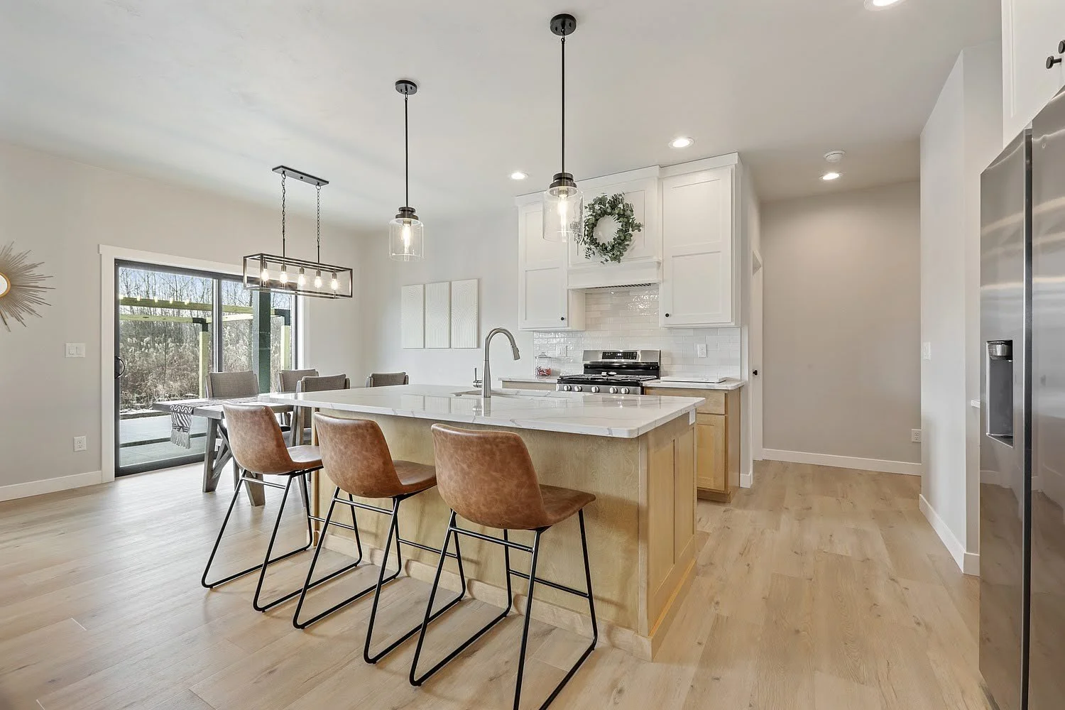 Open Great Room & Kitchen Layout – Central island and seamless connection to dining and covered patio.
